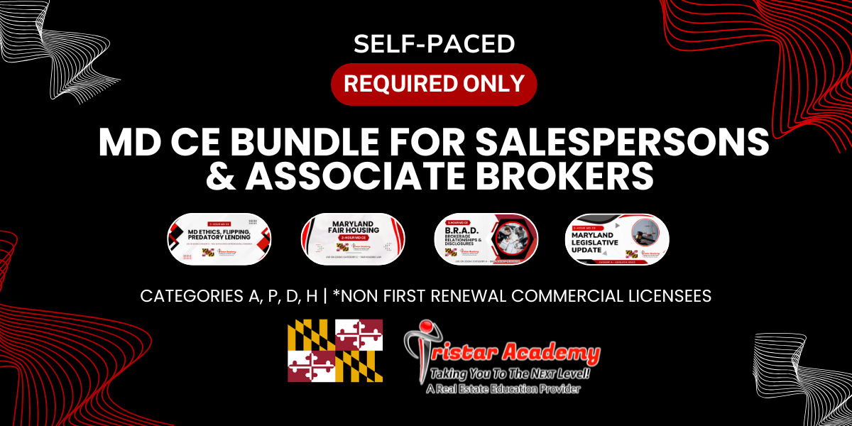This self-paced online bundle satisfies Maryland commercial salesperson and associate broker required CE for Categories A, D, H, and P. Tristar Academy is approved by the Maryland Real Estate Commission for continuing education.